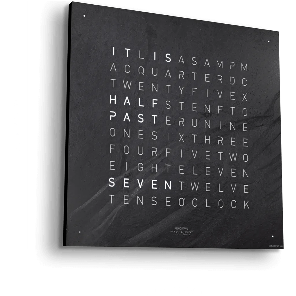 For the QLOCKTWO® CREATOR'S EDITION METAMORPHITE, 350 to 400 million years of pressure had to be exerted until grey slate formed from clay slurry, which ultimately adorns the front of a QLOCKTWO® CLASSIC in this removable front cover.