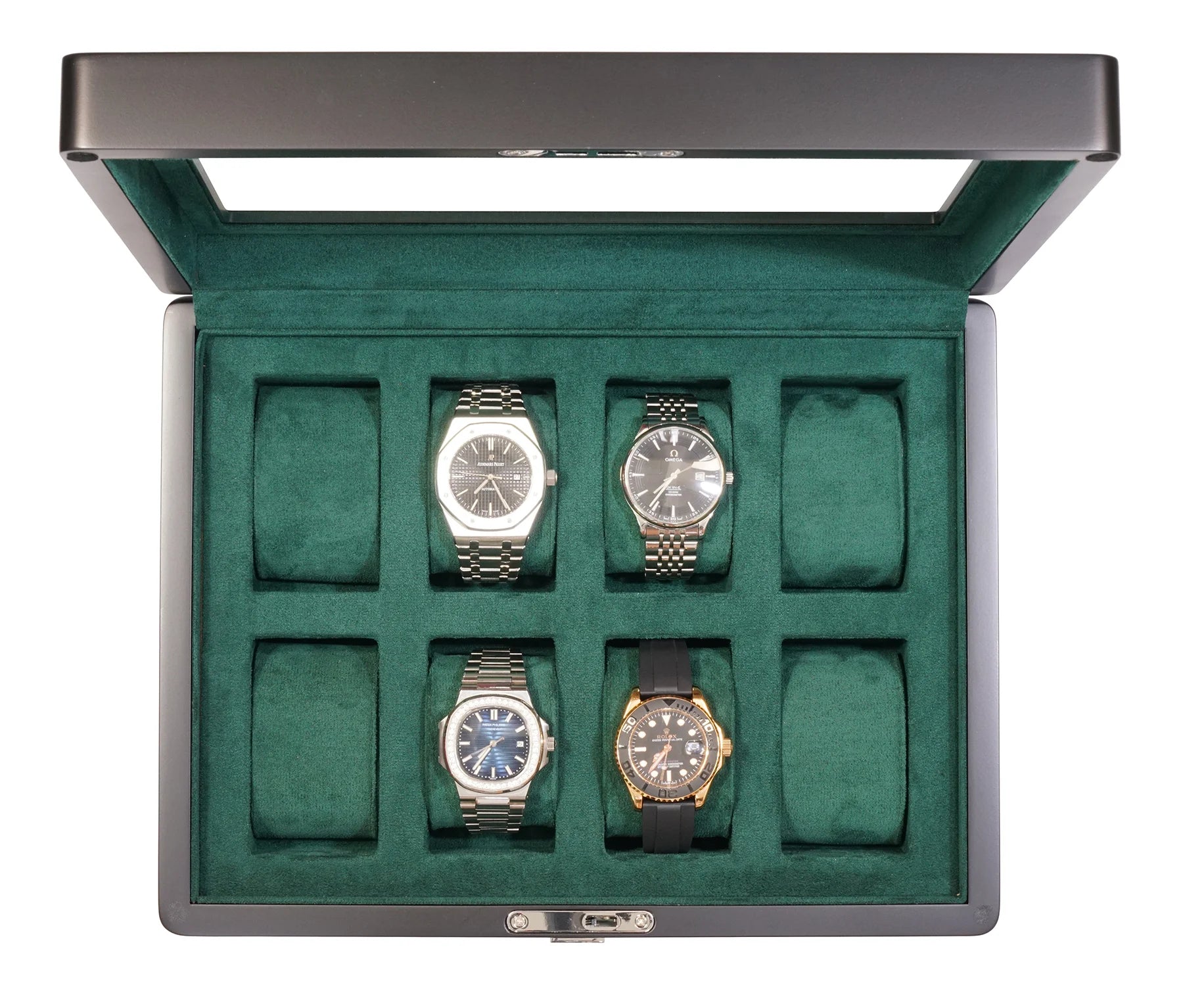 The William fits 8 of your finest. Each of the eight soft cushion is 50mm wide allowing plenty of space around even the widest of timepieces. The interior is lined with plush velvet and is accentuated by the dark matte satin coated wood. You can Look down on your disciples through the top viewing panel.