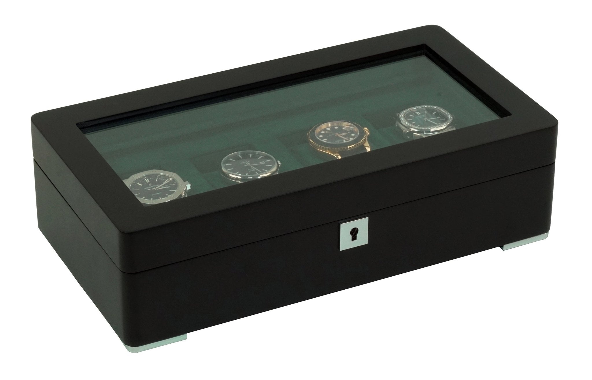 The George has room for 4. Each of the soft cushion is 50mm wide allowing plenty of space around even the widest of timepieces. The interior is lined with plush velvet and is accentuated by the dark matte satin coated wood. You can Look down on your loyalists through the top viewing panel.