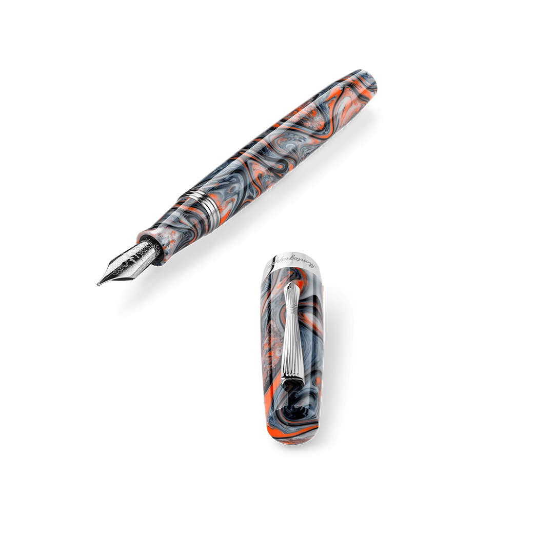 The Montegrappa Elmo pen draws inspiration from a storied lineage of design innovation. This contemporary interpretation honours the brand's heritage through carefully considered details: tapered ends, a distinctive grip profile, and a brass "cumberbund" clip reminiscent of 1920s elegance with subtle art deco undertones. The swirled marbled finish sets each pen apart, with randomly occurring patterns that ensure no two pieces are identical. Crafted in Montegrappa's modern workshop, the Elmo pen represents the same spirit of ingenuity that once defined an era when writing instruments were essential tools of distinction and personal expression.