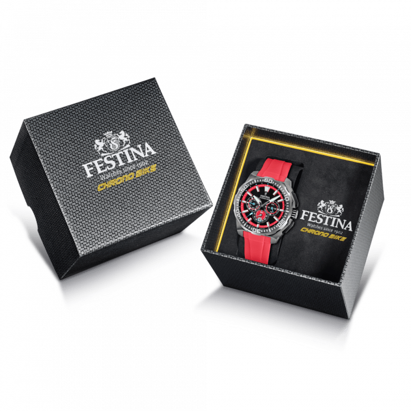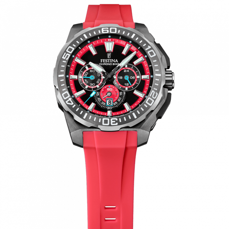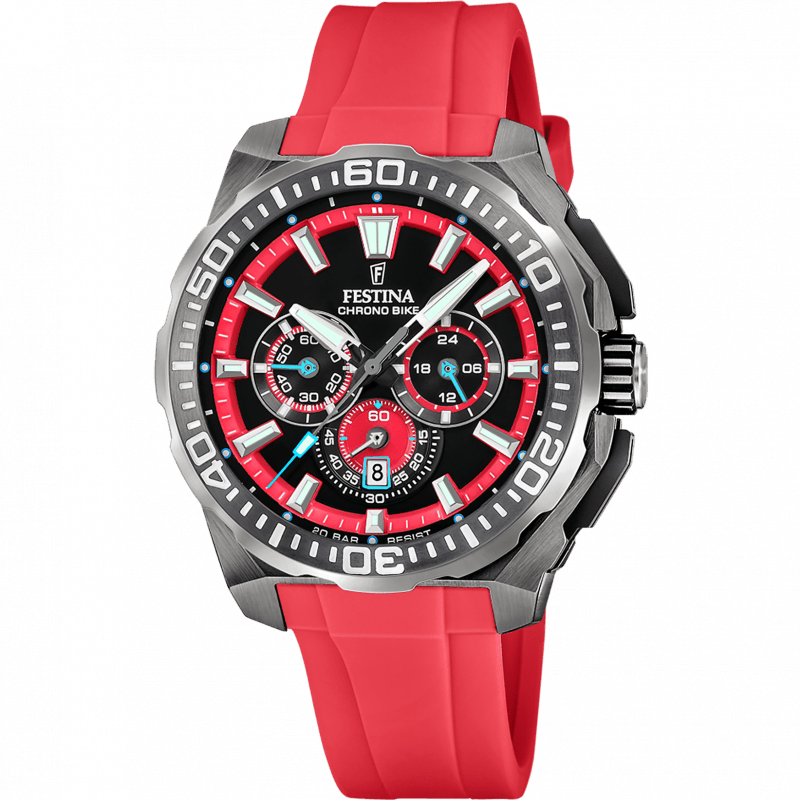 The Festina Chrono Bike 2025 delivers a blend of precision and durability within a sporty, resilient frame. Its 45.5 mm stainless steel case guarantees toughness, complemented by a flexible silicone strap that ensures comfort during any endeavor. Powered by a MOS20 quartz movement, this chronograph provides precise timekeeping and includes a date display at 6 o'clock for practical use. The dial features vivid accents, applied indexes, and luminescent hands, offering clear visibility under all lighting conditions. Protected by a mineral crystal and water-resistant up to 20 ATM, this watch is built to endure an active lifestyle. Ideal for those seeking a dependable, performance-driven timepiece with strong sporty appeal.