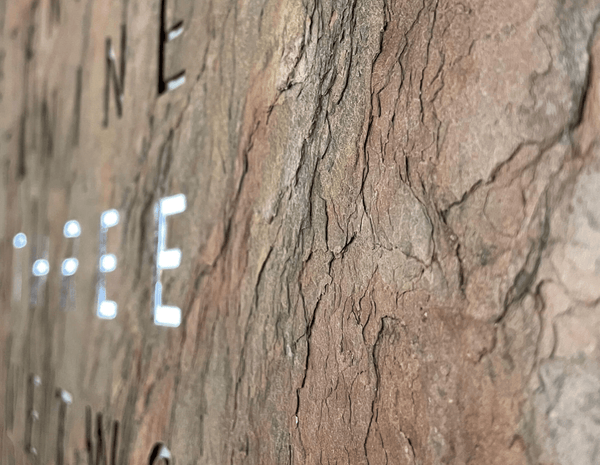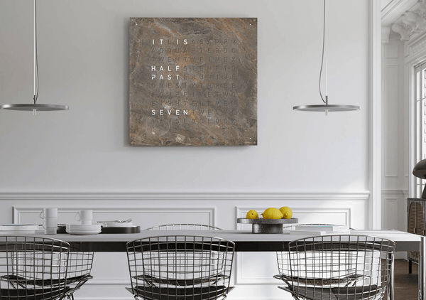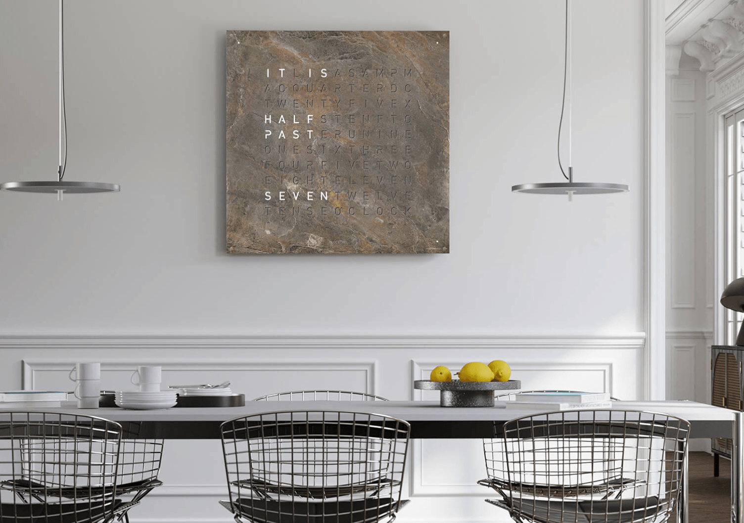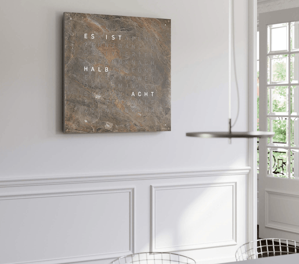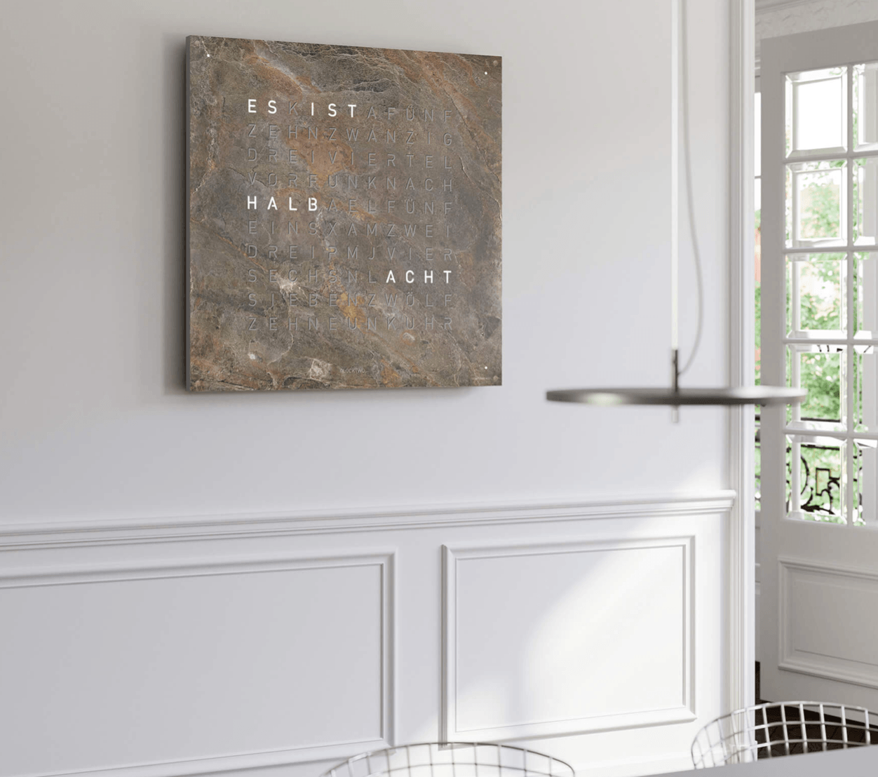 The Qlocktwo Large Glintscape is created from million year old sedimentary rock, sliced delicately thin and laser cut to reveal 110 seemingly jumbled letters.