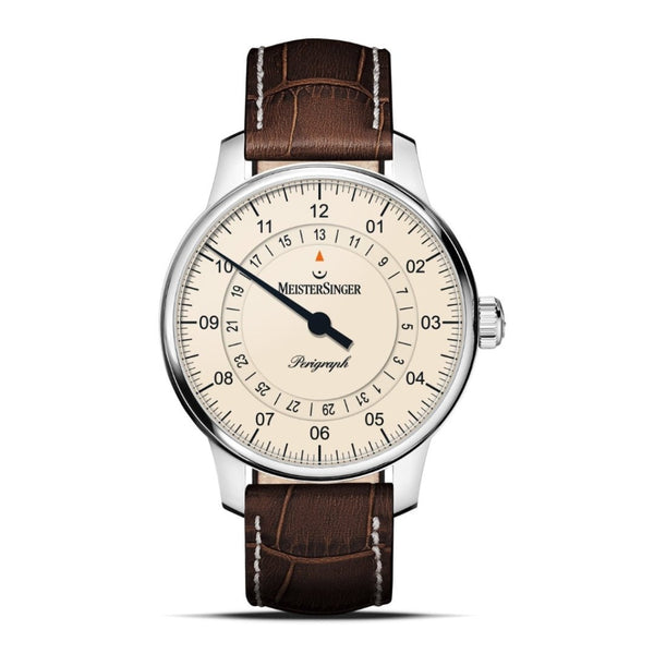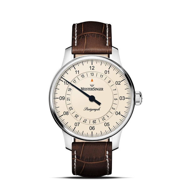 MeisterSinger often has a flair for the unusual when designing its single-hand watches and the Perigraph, which also features a date display, is no exception. The beautifully balanced date ring rotates freely around the center of the dial. A small arrow at 12 o’clock points to the current date, which advances one step each day at midnight. This analog representation of the date corresponds to the circular time display and provides just as much of an overview.