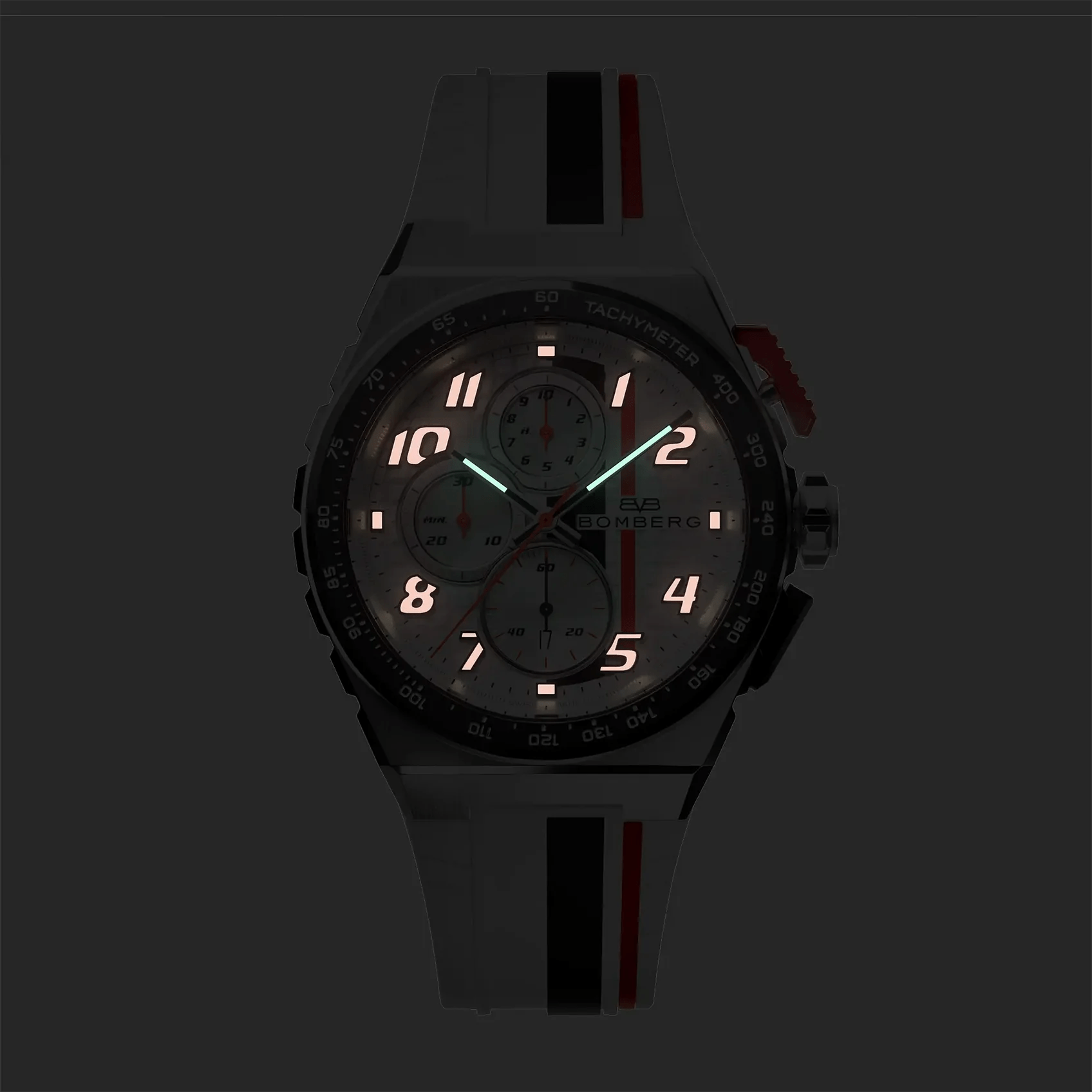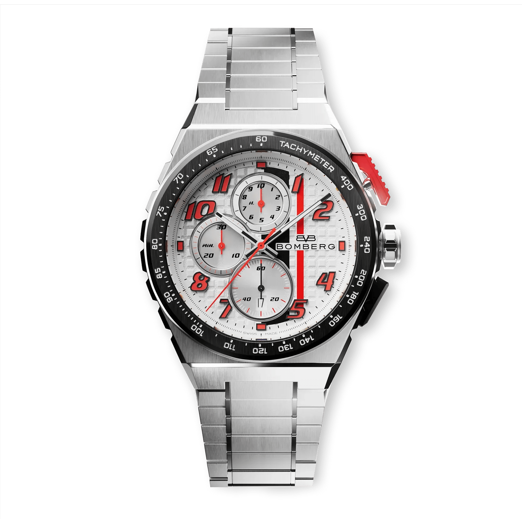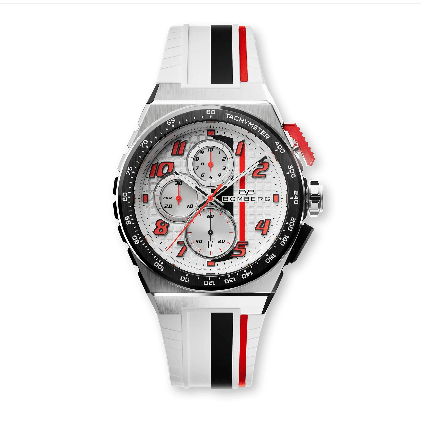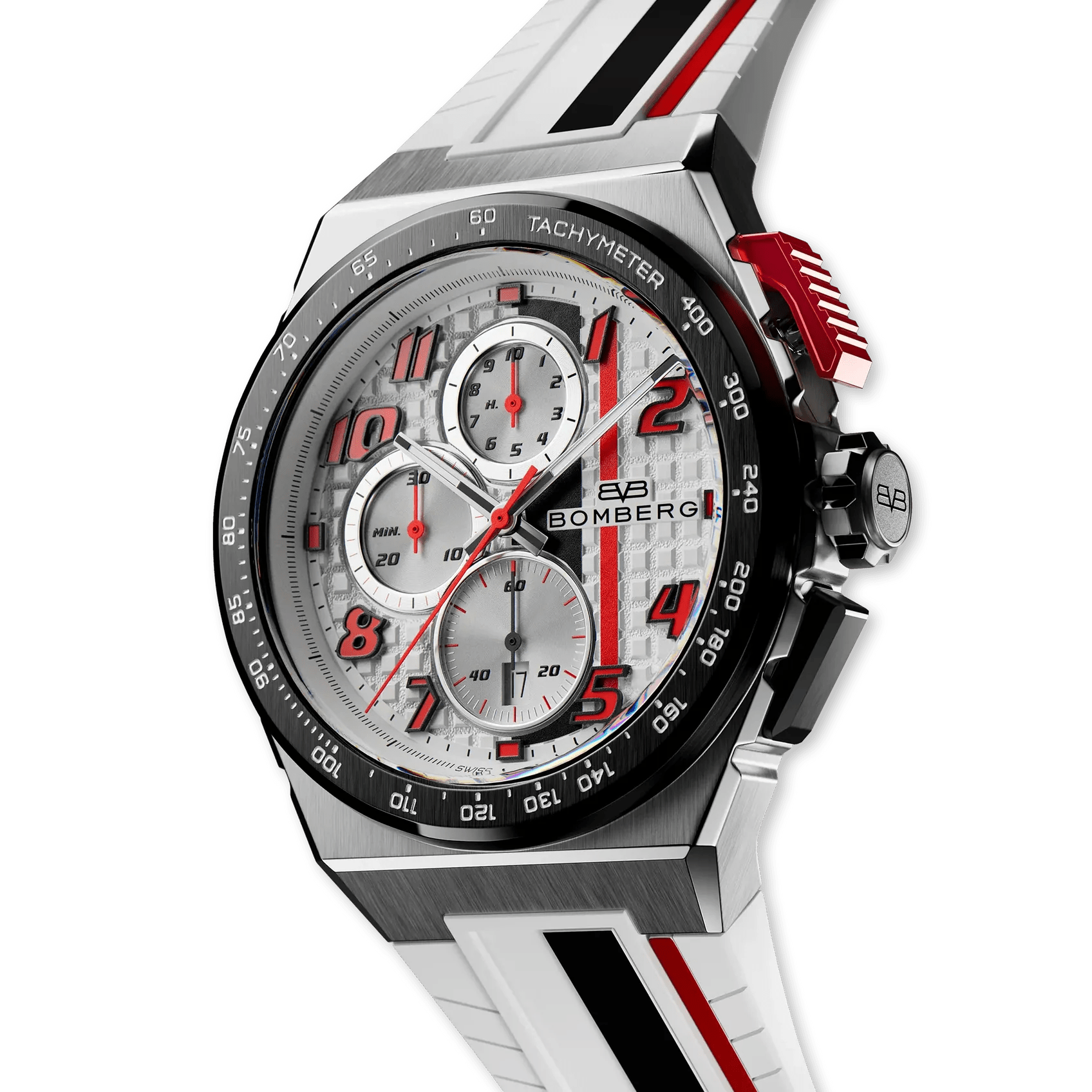 The Bomberg Apex ushers in a revolutionary era in racing-inspired design. Its 42mm case has been completely reimagined with sharp angles and a powerful Swiss chronograph movement, making it the ultimate choice for the track. With distinct features like the aluminum tachymeter bezel, textured dial, and optimized pushers, APEX flawlessly embodies the essence of speed. Additionally, each model pays homage to iconic motorsport liveries, perfectly blending racing heritage with Swiss precision.