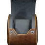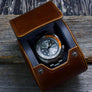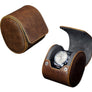 Introducing the Vintage Traveller Watch Roll, available in two sizes, single for that quicky or the triple watch roll for those longer trips. The Vintage Traveller is made from Smooth Vegan Vintage brown leather with colour matched stitching. Gunmetal press studs keep the soft lined rigid hood securely in place to protect your timepieces. The soft grey cushion fits perfectly in the hard case giving your timepiece the ultimate protection, whilst still looking good.